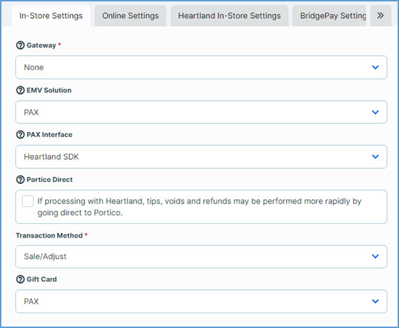 - In the Payment Gateway screen, in the In-Store Settings area, select PAX in the EMV Solution list.