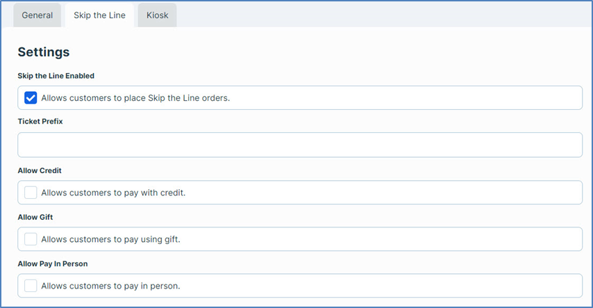 Skip the Line Enabled: If you select this check box, the program will enable the Skip the Line features for the location. The program will make the controls for configuring Skip the Line available, and the apps will include controls to allow customers to place Skip the Line orders.