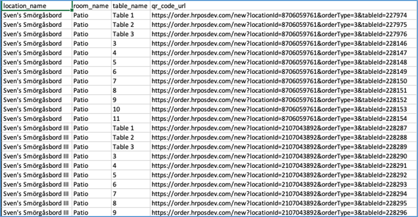 The POS will export a list (in CSV format) of the tables in the selected room, including each table’s location, room, name, and QR code URL.