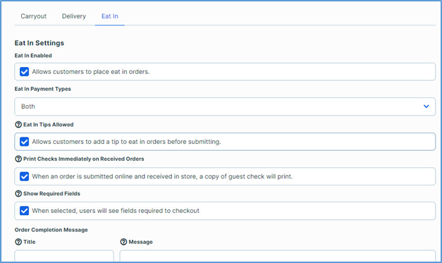 Order Completion Message: These boxes enable you to add a customized text message that will display when customers complete an order in the Online Ordering website. Using these controls, you can create a closing message for online “eat in” orders.