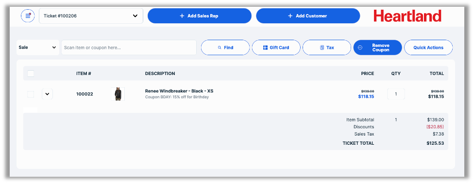 - Only one coupon can be added to a POS ticket at a time. If, after applying a coupon, you scan another coupon code to a ticket, it will replace the previously applied coupon code on the ticket.
