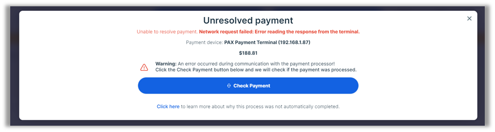 Please note: Should a user cancel this process by closing the modal, they can proceed with taking payments again, but it may result in duplicate payments. At such point, they will see the Resolve button on the top bar. If they click Resolve, the POS will again attempt auto-reconciliation. If it fails, it will fall back to manual reconciliation flow.