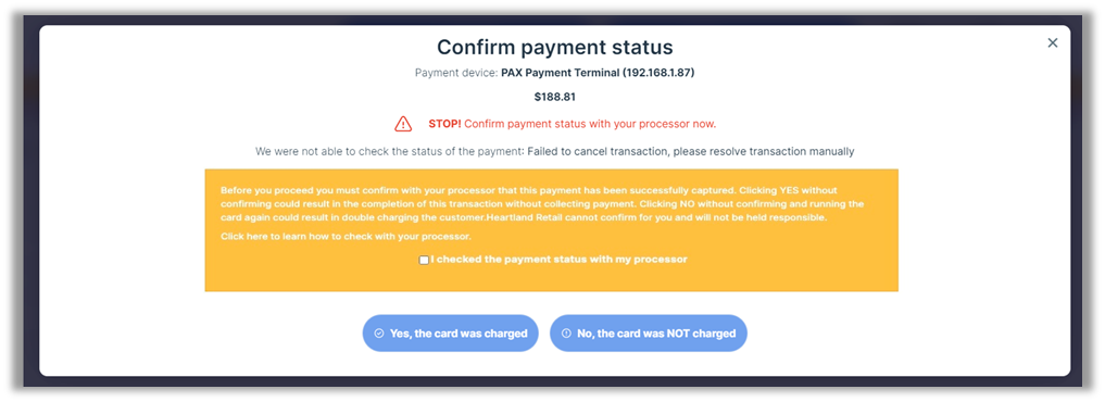 Previously, if a transaction failed due to an offline payment device (for example, because of an IP address change or being turned off), the POS would mark the payment as unresolved and would then prompt the user to confirm the payment status. With recent enhancements, the POS displays a message informing the user that the payment failed due to a device communication failure. As well, with recent enhancements, Heartland Retail regularly pings payment devices and displays alerts if the device is not communicating. This allows users to know the status of the device before attempting a payment.