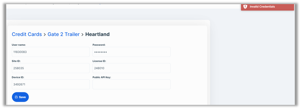 In cases where invalid credentials were saved in POS settings before this validation was in effect, should a merchant attempt a payment or reconciliation, rather than simply marking the payment as failed, the POS will display an authentication error indicating 'invalid credentials'. This message will display as a red toast message, similar to the behavior noted above when attempting to save invalid credentials.