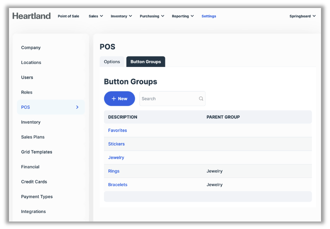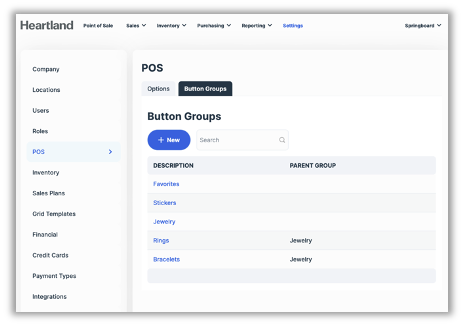- To search for a button group, go to Settings and select POS from the lefthand menu.