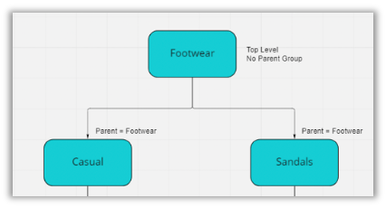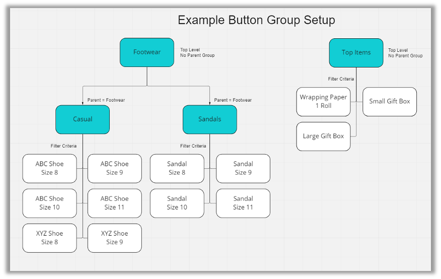 - If you would like to organize item buttons more granularly, you can create additional groups and select a first level button group as the Parent Group. In the example below, Footwear is the first-level (parent) button group, and Casual and Sandals are subgroups.