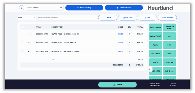 Here we describe how to configure your Heartland Retail system to use Quick Item Buttons. These buttons allow users to quickly add items to tickets, without the need for scanning or searching. Here is a diagram indicating the flow: