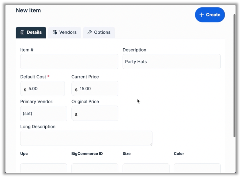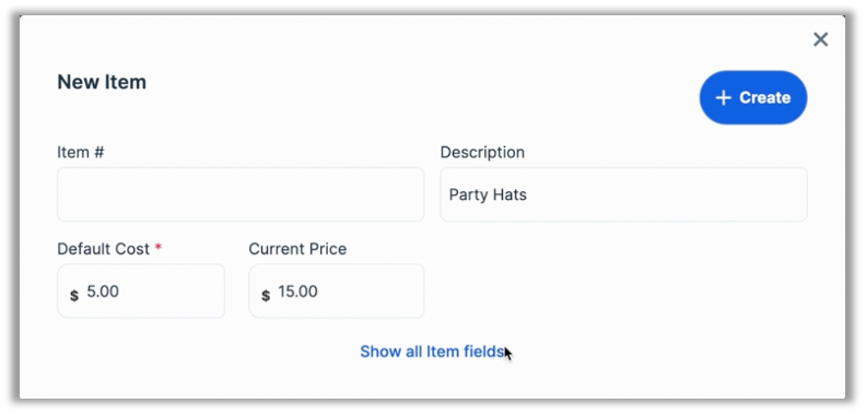 Enter values as desired and click Create to save the new item. If needed, you can opt to Show all item fields before saving the items. Doing so will open this screen where you can enter additional item details:
