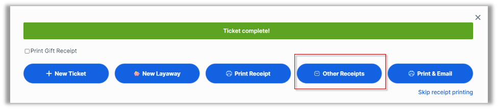 With this feature enabled, the POS will display an Other Receipt button on the Ticket complete modal at the time of tender.