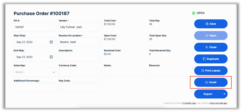 - When you are ready to email a purchase order, first select the purchase order from the list.