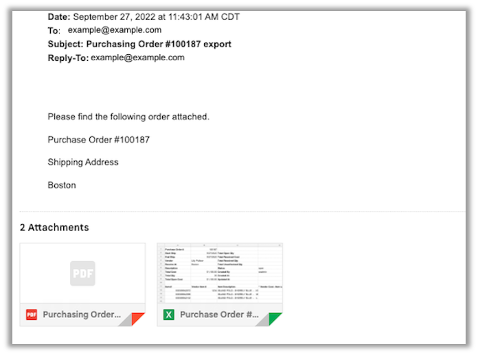 The email will include the purchase order number in the subject line. The body of the email will include the purchase order number, along with the shipping address and location.