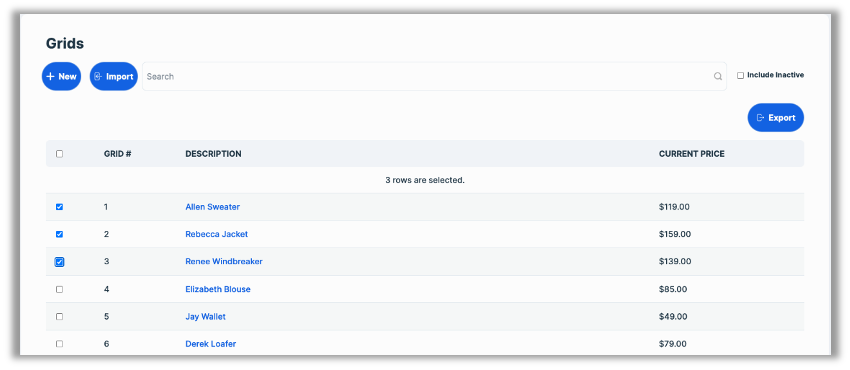 - The resulting file (.xlsx or .csv format) will include fields for the selected grid’s attributes which you can then edit and import to update the grids in your POS.