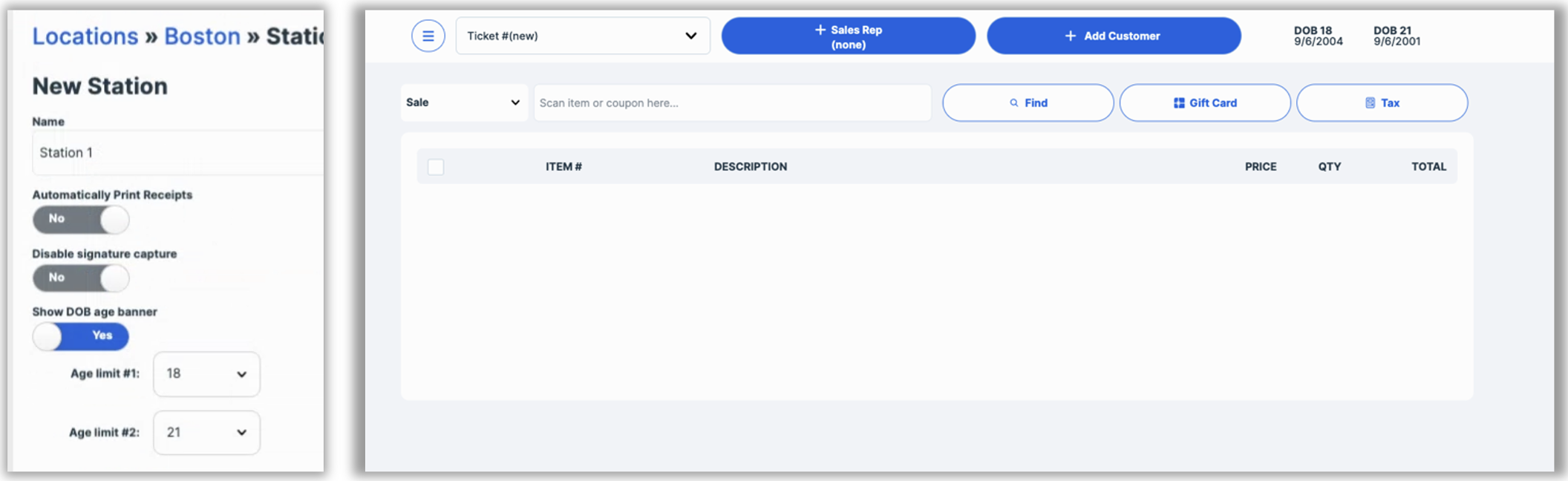 To facilitate the sale of age-restricted items, you can configure your POS to display a DOB (date of birth) banner on designated workstations. When the corresponding Show DOB age banner is enabled for a station, this banner will display in the upper right corner of the app and will show ‘born on or before’ birthdates for defined age requirements. In this example, we see DOB banners for two age requirements, 18 and 21 years old. You can enable this under Settings | Locations | Stations | Station Settings.