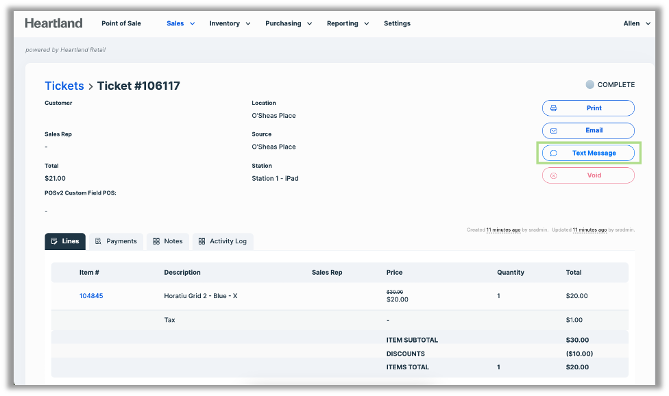 If the need arises to resend a text receipt, locate the ticket via Sales | Tickets and select the Text Message button on the right side of the screen.