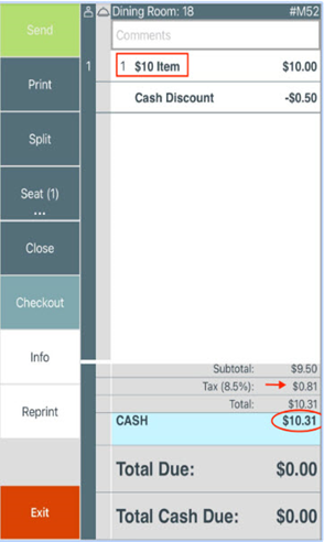In its totals area, the Checkout screen displays separate lines for the ticket’s Total Due (the total paid with credit or other tenders) and Cash Total Due (the total paid with cash). It also displays a tax amount calculated from the Total Due. When you add a cash payment to a ticket, the POS recalculates the tax total based on the Apply Post-tax setting in the Admin Console.