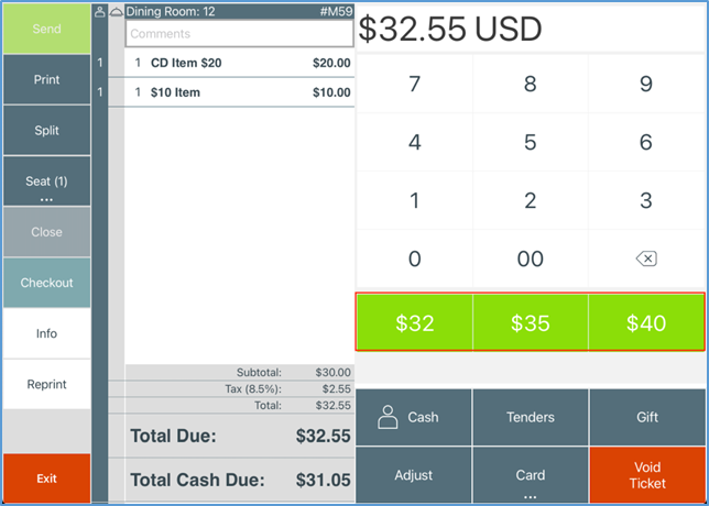 In the Checkout screen, the quick tender options will display amounts rounded up to the nearest dollar, even when displaying the ticket’s remaining total amount due. The POS displays these options with rounded cash amounts because most cash payments have full dollar amounts and do not include exact change.