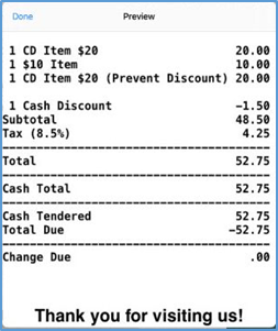 Payment receipts include the total cash discount amount right above the Subtotal. The amount is accurate, with a Change Due amount of “.00”.
