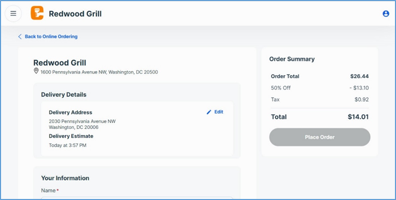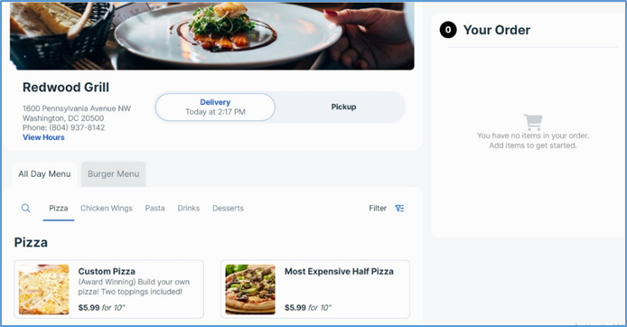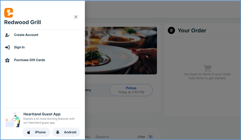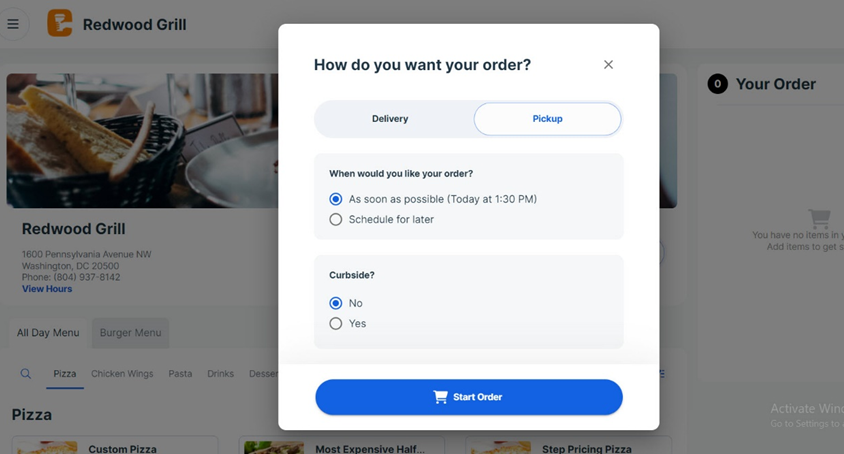For both Delivery or Pickup orders, when you click Start Order, the panel closes and displays the Online Ordering menu.