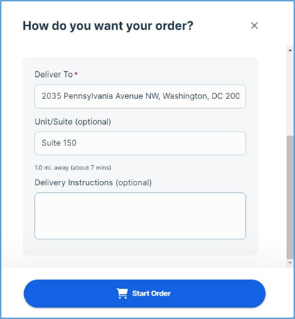 The Schedule for later option is only available if the location is set to use future orders. If you select Schedule for later, the Date and Time boxes display. In these boxes, select the specific date and time when you want the order to be ready (for either delivery or pickup). - If you selected Delivery in Step 3, enter the delivery destination’s street address in the Deliver To box, then enter the destination’s unit or suite number (if any) in the Unit/Suite, box, then enter any special delivery instructions in the Delivery Instructions box, then click Start Order.