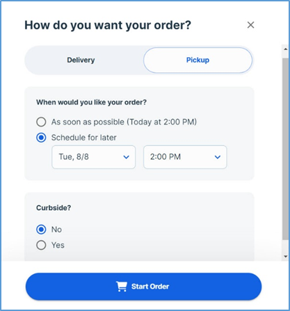 or If you selected Pickup in Step 3, then select No or Yes in the Curbside? area, then click Start Order.