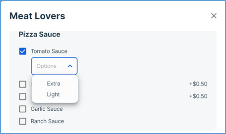 - Certain modifiers may include a list for selecting a larger or smaller portion. If so, select the appropriate portion size in the modifier’s option list.