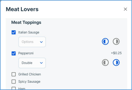 - Certain modifiers might also have “partial topping” options. If so, select the appropriate options for applying the topping to one part or all of its main item.