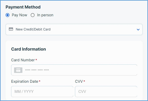 - If you select Both, the webpage will include options to pay either with a credit card or in person.