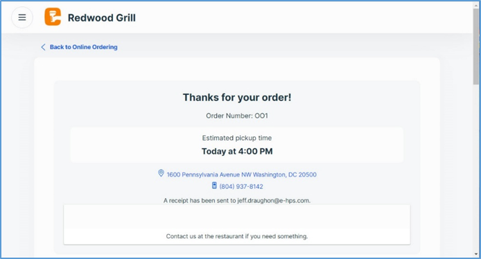 The Online Ordering website will display the Thanks for your order! screen, with the order number and the estimated pickup or delivery time. The program will also send a confirmation email to the customer.