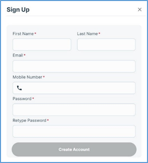 The Navigation Menu lists various options. To create a new account, click Create Account. The program will display the Sign Up panel. In this panel, enter your first and last name, your email address, your phone number, and a valid password, then click Create Account.