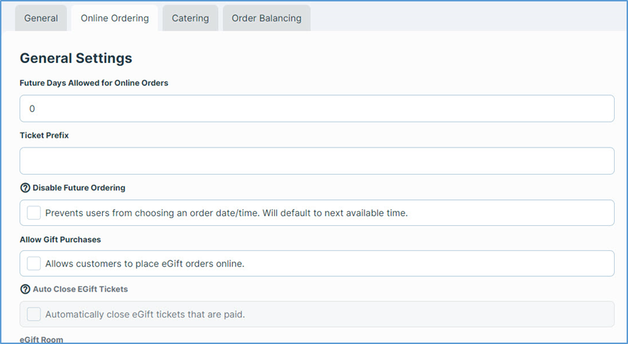 Ticket Prefix: In this box, you can designate a prefix for all catering tickets created in the website so they can be easily identified. You can set a prefix up to four characters long, such as “WEB” and “OLO”.