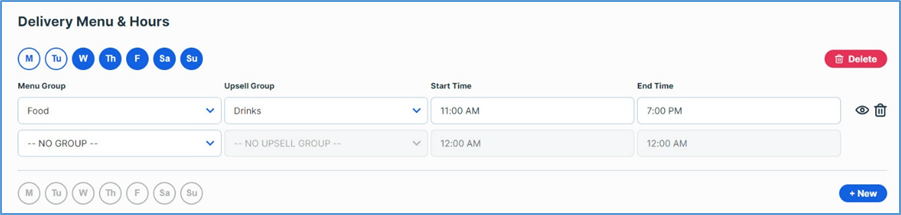 The controls in the Delivery Menu & Hours area enable you to configure the availability of delivery service in the Online Ordering webpage. You can use these controls to designate the days of the week and times of each day when the items of specific menu groups are available for delivery service in the Online Ordering webpage. If you click + New, the program will add one set of controls to the area. You can use these controls to set the availability time for one menu group. You can add multiple menu groups (with separate start and end times) to a single week, or you can add multiple weeks, each with different menu groups.