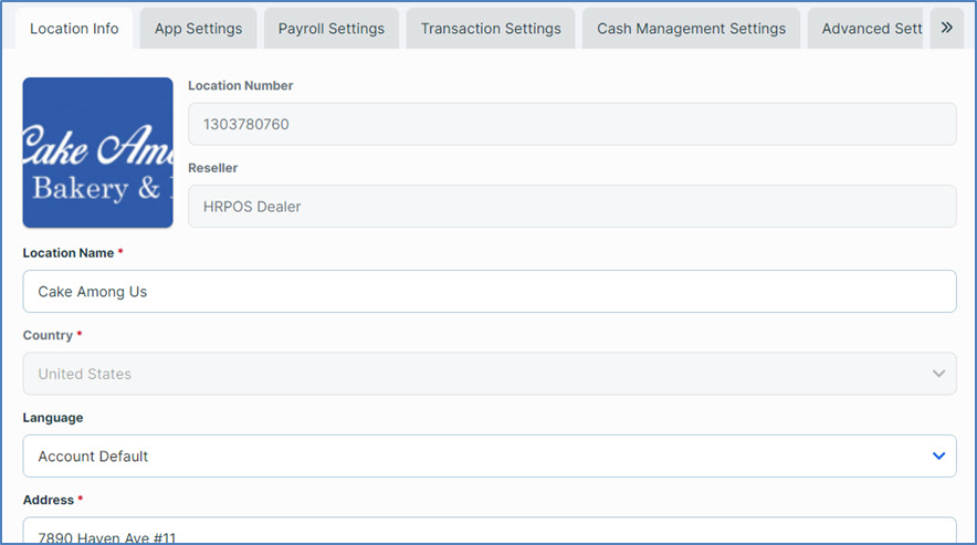 Language: This list enables you to override the account's language setting and set a default language for a specific location. If you select Account Default, the Admin Console and POS will display all labels in the language you set in the account settings. If you select a language (English, Spanish, or Canadian French), the Admin Console and POS will display all labels in the language you select. (If you select a different language for a user in the User Profile screen, that setting will override the location's language setting when that user is logged in.).
