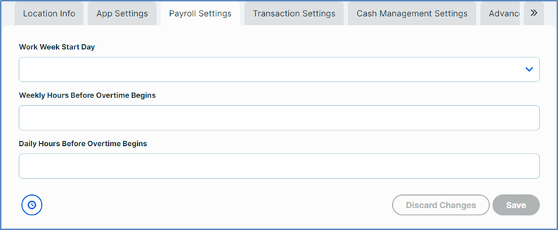 The Payroll Settings tab includes controls that enable you to define the beginning of the location’s standard work week and the range for daily and weekly overtime pay rates.