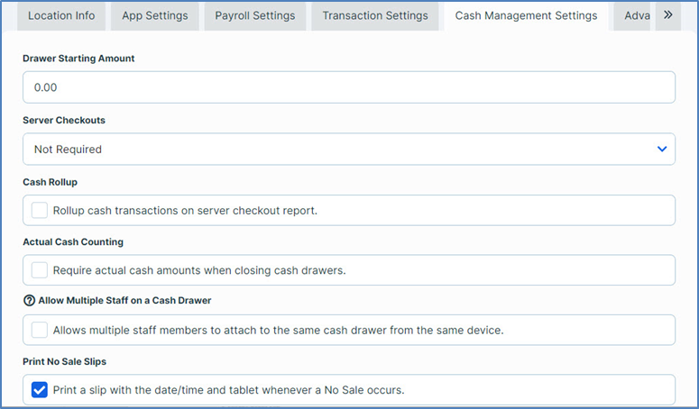 Drawer Starting Amount: In this box, enter the amount of cash that should go into a cash drawer at the beginning of a shift.