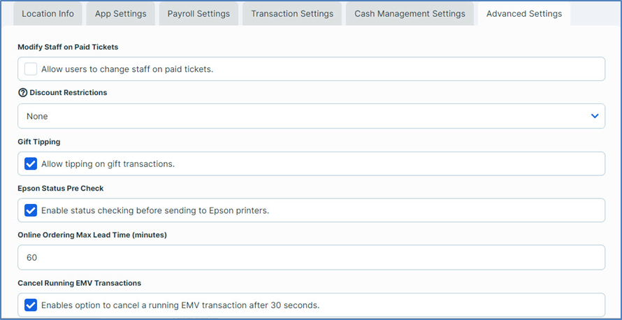 Modify Staff on Paid Tickets: If you select this check box, the POS will allow you to change the server associated with a paid ticket. If you clear this check box, the POS will allow servers to access a paid ticket’s info screen, but not change its server.