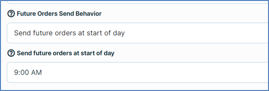 If you select Send future orders at start of day, the POS will hold each future order it receives until the date of its prep time, then it will send all future orders for the current day to the kitchen printers at the start of that business day. When you select this option, the program displays the Send future orders at start of day box, enabling you to enter the time of the location’s start of day. For instance, if you enter “9:00 AM” in this box, the POS will send all held future orders for the current to the kitchen printers at 9:00 AM.