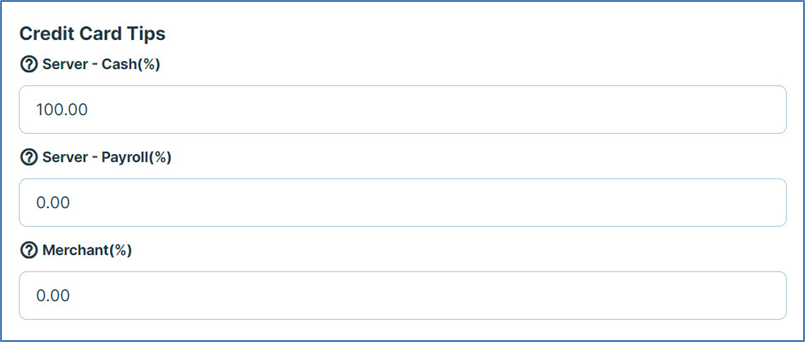 For each of these five types of transactions, you can set the percentage amount that goes to the server as cash, that goes to the server in payroll, and that is withheld for the merchant.
