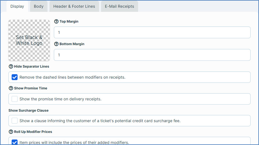 Show Promise Times: This box enables you to include promised prep times on printed receipts for delivery and future orders. If you select this check box, the POS will print the promise time on any receipts for orders that have a promise time.