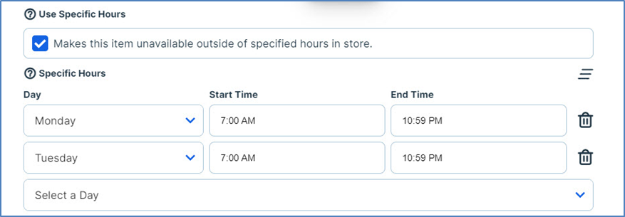 Specific Hours: If the items in this group are only available during certain days of the week or hours of the day, you can use the controls in the Specific Hours list to specify which days and time ranges they are available. These boxes only display if you select the Use Specific Hours check box.