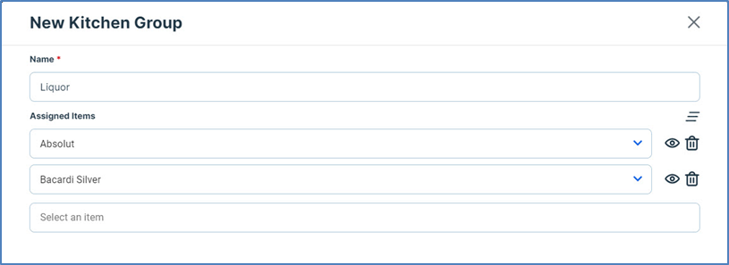 Assigned Items: In this list, you can select one or more menu items to associate with this kitchen group. For example, if you create a new kitchen group called “Dessert Bar”, you might assign such menu items as “Cookies”, “Brownies”, and “Chocolate Cake”.