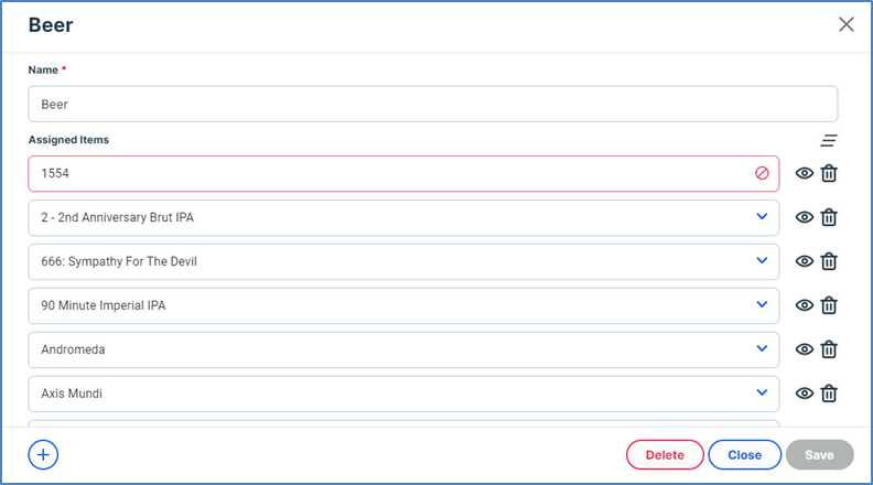 Assigned Items: In this list, you can select one or more menu items to associate with this report category. For example, if you create a new report category called “Beverages”, you might want to assign all non-alcohol beverage items to it, such as Fountain Soda, Tea, and Coffee. To delete a menu item from this list, click its Delete button.