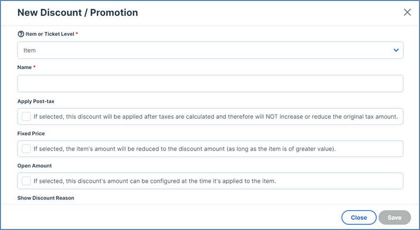 Item or Ticket Level: In this list, select the appropriate level for the discount or promotion. To create a discount or promotion for a specific menu item, select Item. To create a discount or promotion that modifies an entire ticket, select Ticket.