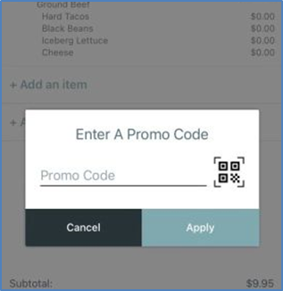 Promo Code: In this box, enter an alphanumeric code for this promotion. Later, while placing an order, if a customer enters this code into the Promo Code box, the app will apply the promotion’s discount or adjustment to the order.