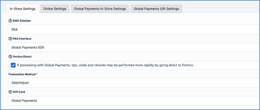 To find the information needed for the settings in the Global Payments In-Store Settings tab, refer to the “The Enterprise Hub: Activation Notice for PAX” for the five-part Portico credentials.