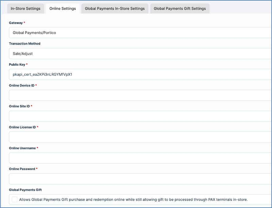 Global Payments Gift: If you select this check box, the program will provide gift card service in the Online Ordering app and also accept and process gift card transactions in-store. If you select this check box, the program will display the Global Payments Gift Settings panel.
