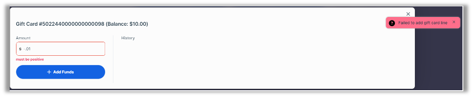 Given that the sale of a gift card should always result in the gift card being loaded with a positive amount, the POS now validates amounts entered when selling new gift cards and adding value to existing gift cards. If you enter a zero or negative amount, the POS will display an error indicating that it failed to add the gift card line and will display a red notation under the Amount field indicating that the value must be positive.