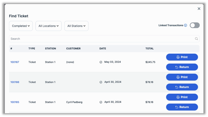For a better user experience when viewing tickets, we have added a Linked Transactions toggle to the Find Ticket modal.