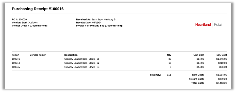 To give merchants a clearer picture of all cost components on purchase order receipts, we have added a Freight Cost line to PDFs of such receipts. Here is an example: