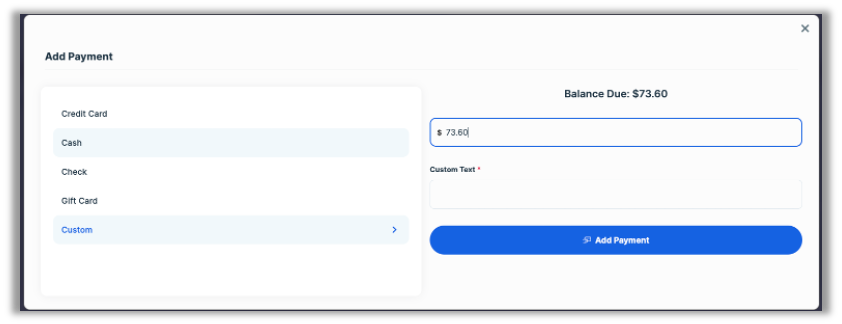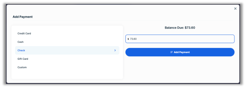 As well, we have shifted the components of the cash payment screen to align with those of other payment screens. Specifically, The Balance Due amount has been moved to the top of the screen with the amount field just below. The Add Payment has been moved to the bottom of the screen.