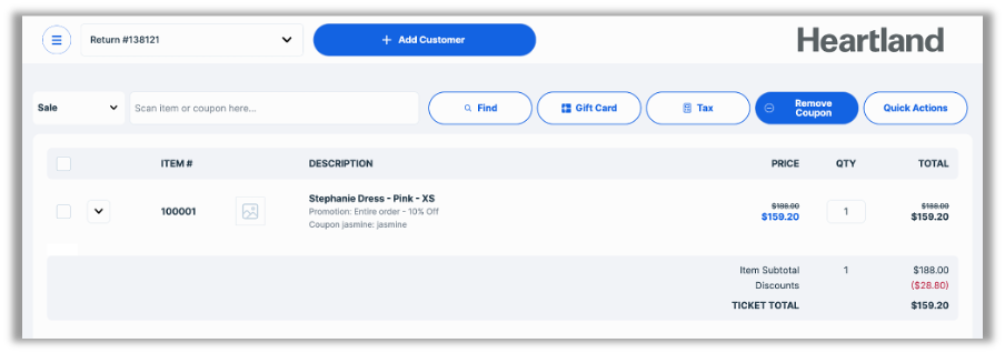 The POS will no longer display the Remove Coupon button when processing a return from a linked ticket using Referenced Returns. Since coupons originate from the original ticket and therefore cannot be removed, the button serves no purpose in the context of Referenced Returns. As demonstrated in the images below, the Remove Coupon button initially displays for a return including a discounted item but, once linked to a sales ticket, it no longer displays.